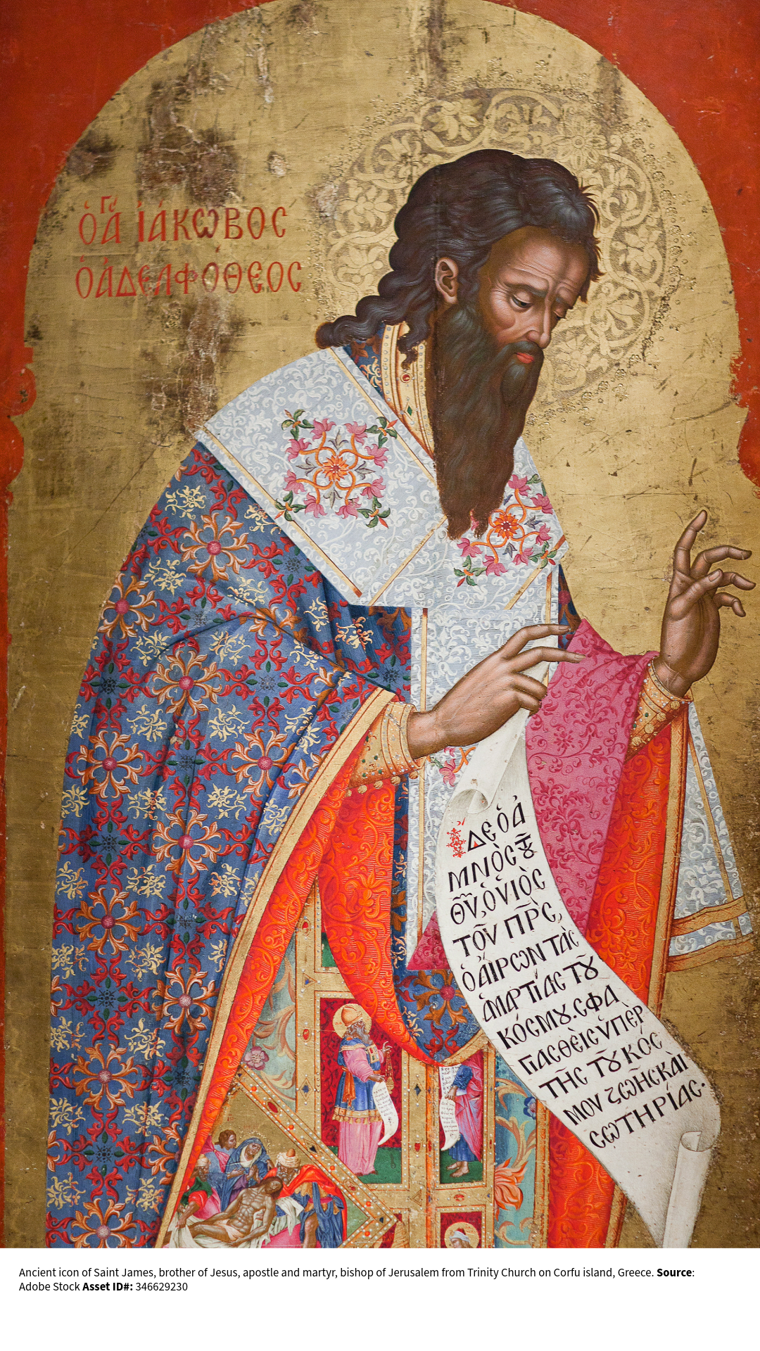 Ancient icon of Saint James, brother of Jesus, apostle and martyr, bishop of Jerusalem from Trinity Church on Corfu island, Greece. Source: Adobe Stock Asset ID#: 346629230